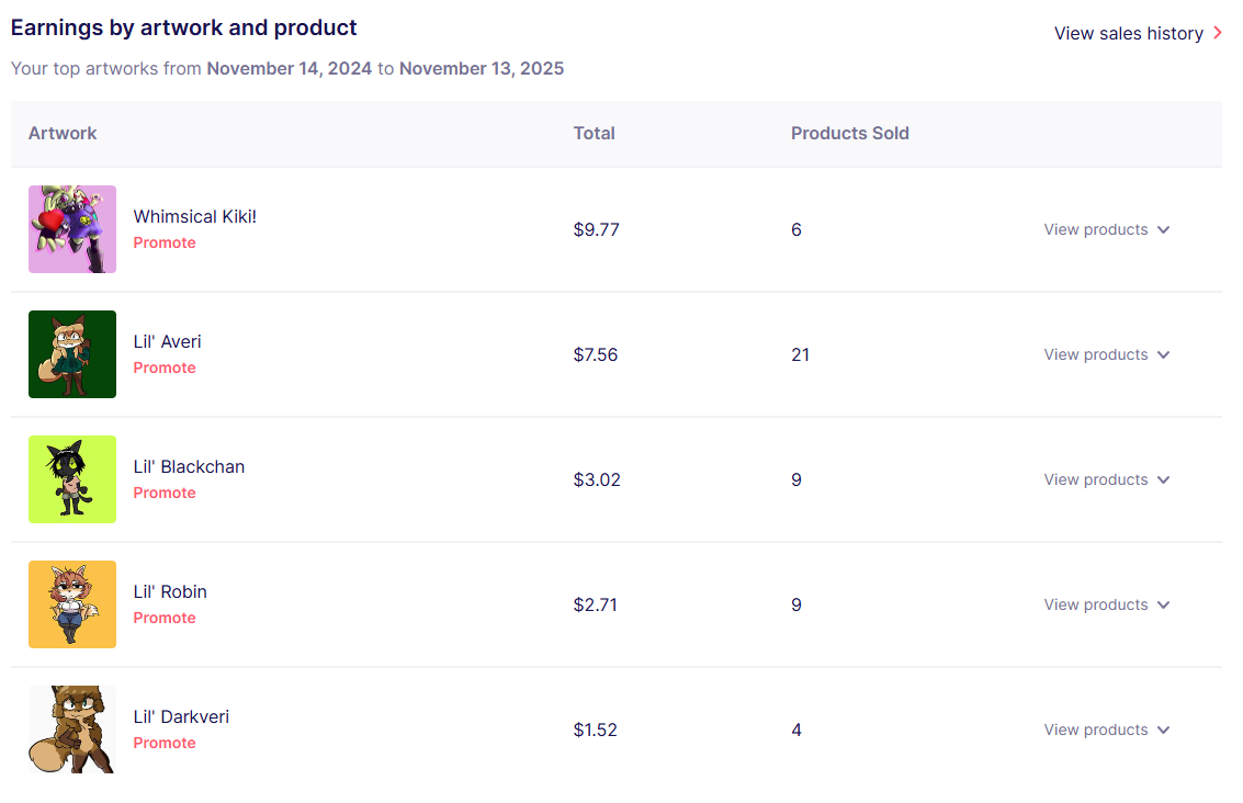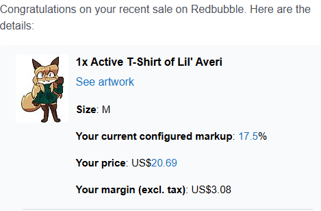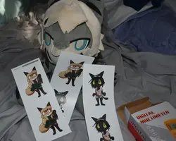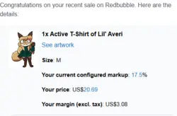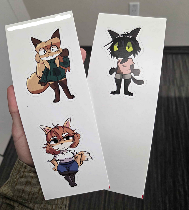 IMO, judging by the amount of money you're making off of these stickers, (which is really not much, unless $7.56 with 21 stickers sold means $7.56 per sticker, but it says total so I'm assuming it's $7.56 fur all 21. Idk how this works sorry lol) I think you should be fine. I don't think whoever is the owner of Bully Fox is really going to be upset that someone made 3 dollars off of their fanart of their character. Same applies to Averi, I doubt Fiddleafox is going to be upset that someone made 8 dollars off her character. Maybe she would be upset over "darkveri" (lol) but I'm not sure if she could even claim to own that character anyways.