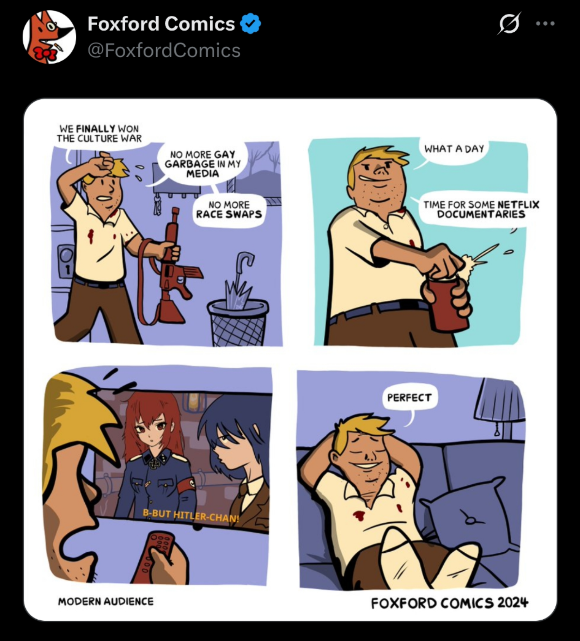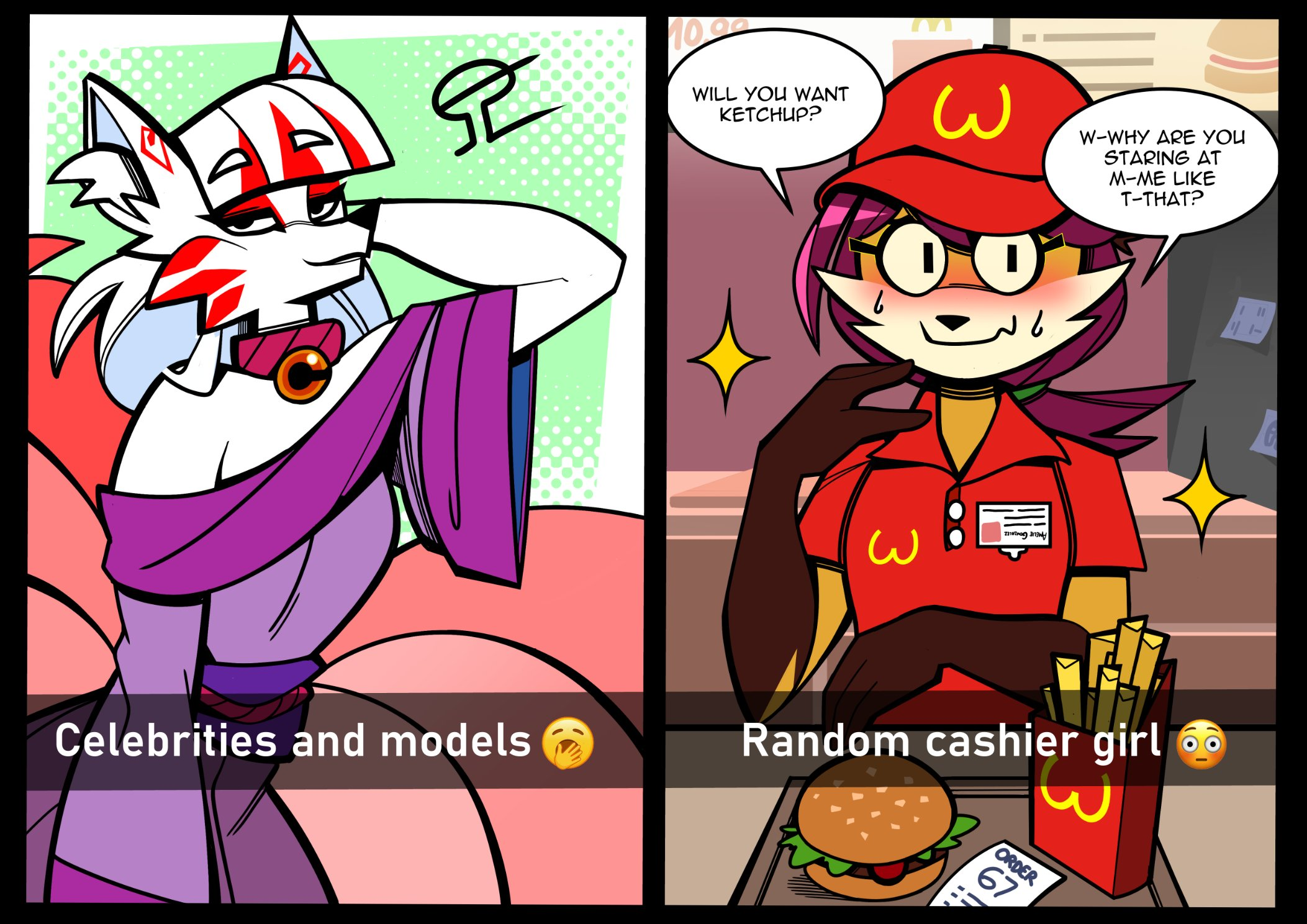 It's a bit hard to define, I agree that it would arbitrarily fall under a "too sexual" or "too obscene" definition. But just to make a case fur this >>88140 particular picture, it's very clearly sexually provocative in a "goofer" way, you have the fox in the center of the picture wearing the tightest jeans imaginable to show off her FAT FOX CUNT and bubble butt, to the left, a pink fox with emphasized, pushed up tits. With the two characters in the back with equally emphasized tits and fox ass. When you look even closer at the image, the cafe itself plays on "goofer" sex jokes with one of the deserts being a vixen creampie (possibly related to the FAT FOX CUNT earlier, or just the establishment as a whole with most of the staff being foxes, with the exception of a raptor(?), whose character design I find kind of neat) and a drawing of a fox head and humongous tits which I just noticed upon further inspection.