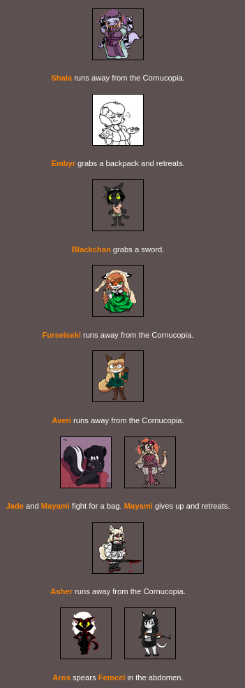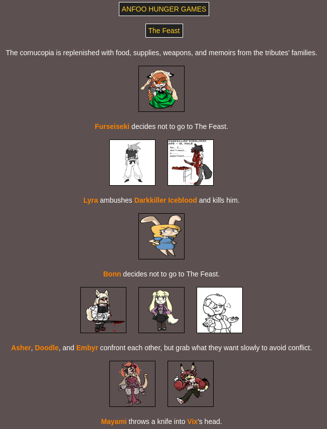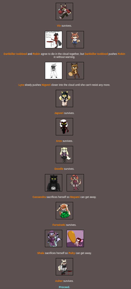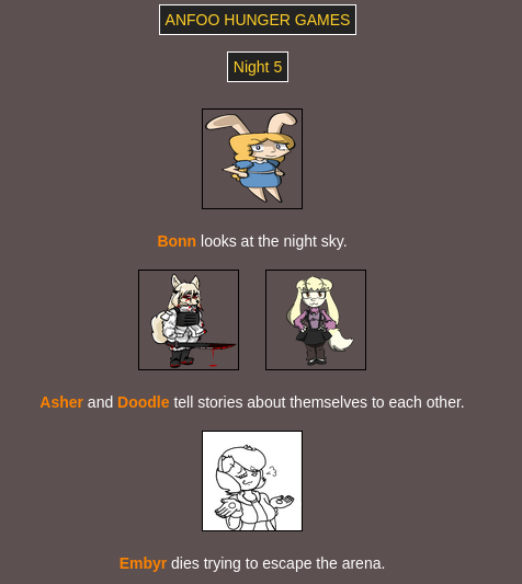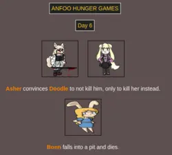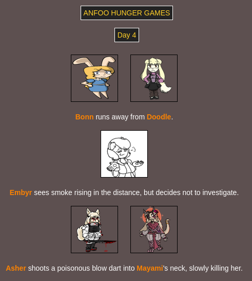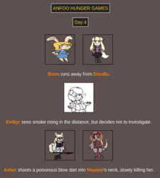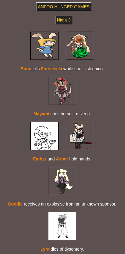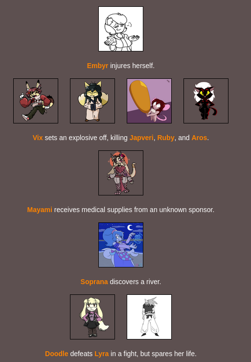 >>8264 bloodiest game ever with only: Doodle Embyr Mayami Lyra Furseiseki Asher Bonn remaining