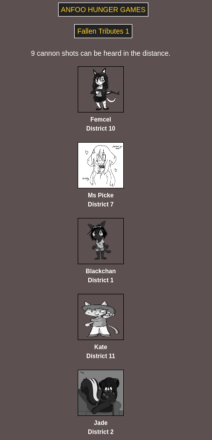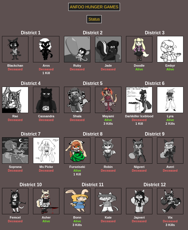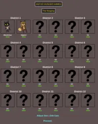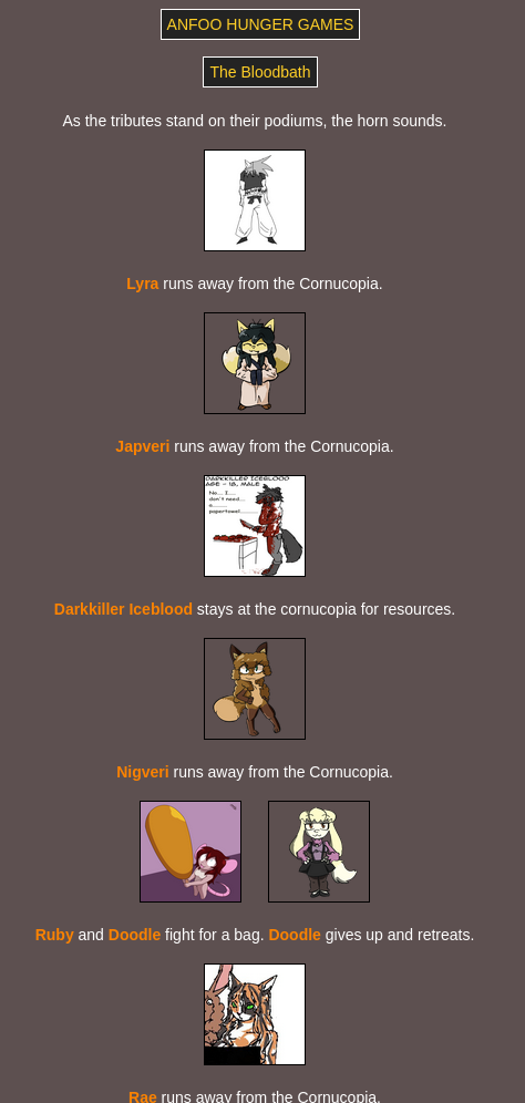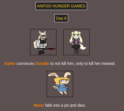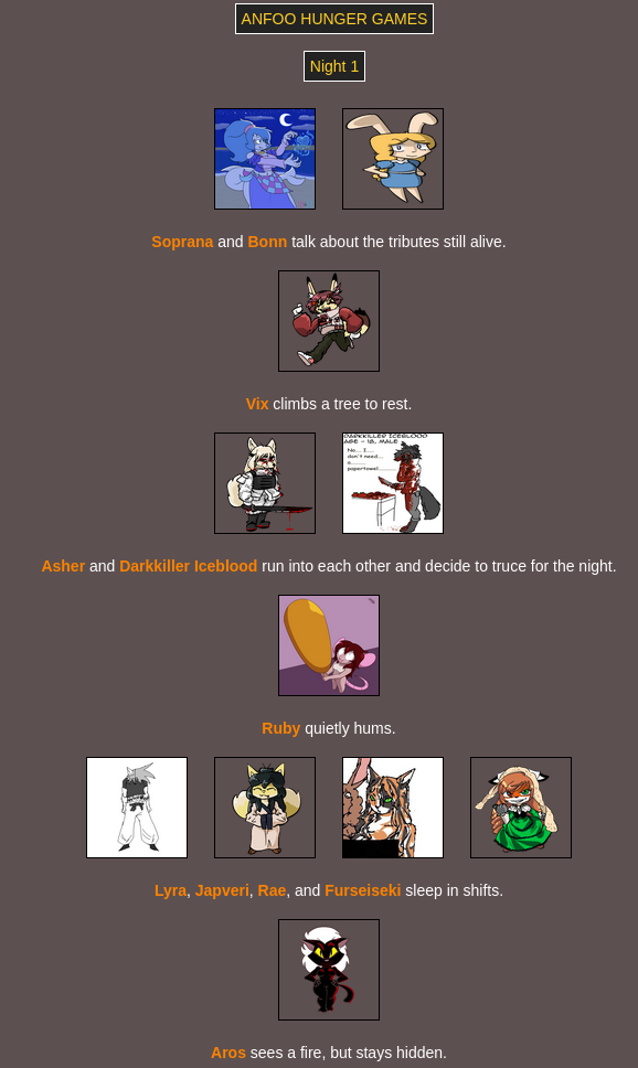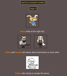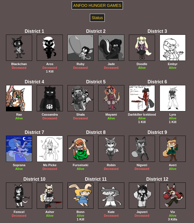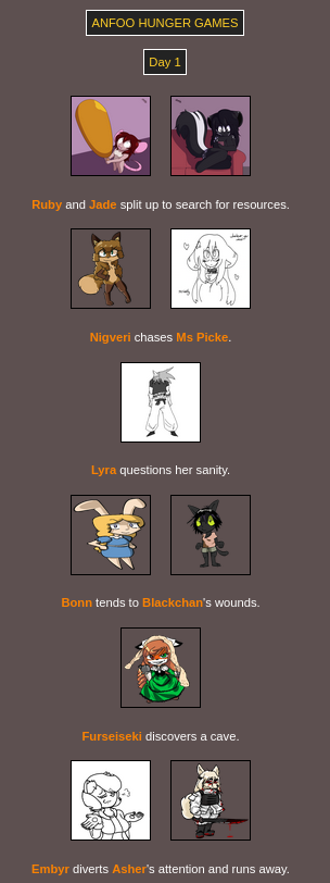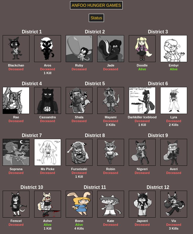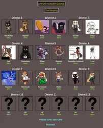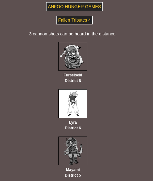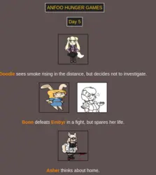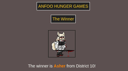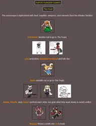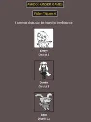 Submit your OCs or Anfoo OCs by 11/16 4pm EST to participate in the hunger games simulator and see who wins. EDIT: moved back to 8pm EST