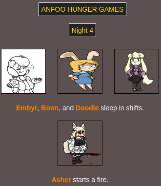 Embyr dies ((( trying to escape the arena ))) but we all know it was Bonn who set her up/made her do it Asher decided to switch up and is now trying to rizz up Doodle