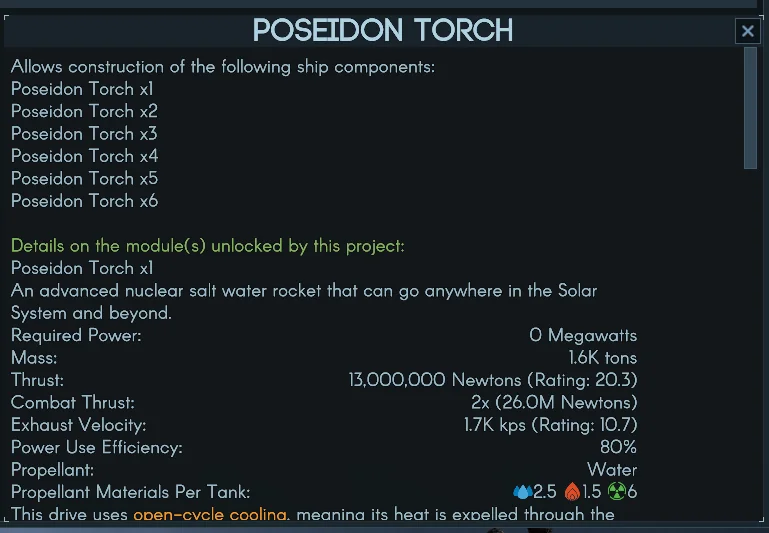 For the curious. The tl;dr is, imagine a large-ish, on the order of tens of meters in diameter, hollow incomplete sphere lined with a heat-resistant material that reflects neutrons, like maybe tungsten carbide. The sphere is the reaction chamber. One side of it, which we'll call the bottom, has a rocket nozzle sticking out of it. The other, which we'll call the top, has tubes going in that bring in a liquid fuel. This isn't just any rocket fuel. It's soluble uranium salts, like maybe uranium tetrabromide, dissolved in water, with a high level of fissile isotopes like U235 or maybe U233. The concentration of dissolved uranium and the volume and shape of the reaction chamber are designed very carefully so that you get a chain reaction when the chamber is not quite full of fuel; fuel tanks are long and skinny so that a critical mass doesn't form until the fuel is in the reactor. Anyway, when sufficient fuel is in the reactor, a chain reaction takes place. In a millisecond the water mixture flashes over to steam, then plasma, and squirts through the nozzle as a roostertail of radioactive fire going that-a-way at, if you believe Zubrin's back-of-the-envelope calculations, around fifty kilometers a second. That's-a spicy-a meatball! Specific impulse, the number that the rocket scientists call Iₛₚ, is yuge for this system and makes any and all chemical rocket fuels, even the weird exotic ones that use crazy dangerous stuff like chlorine trifluoride as the oxidizer, look pointless.